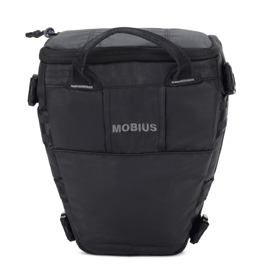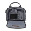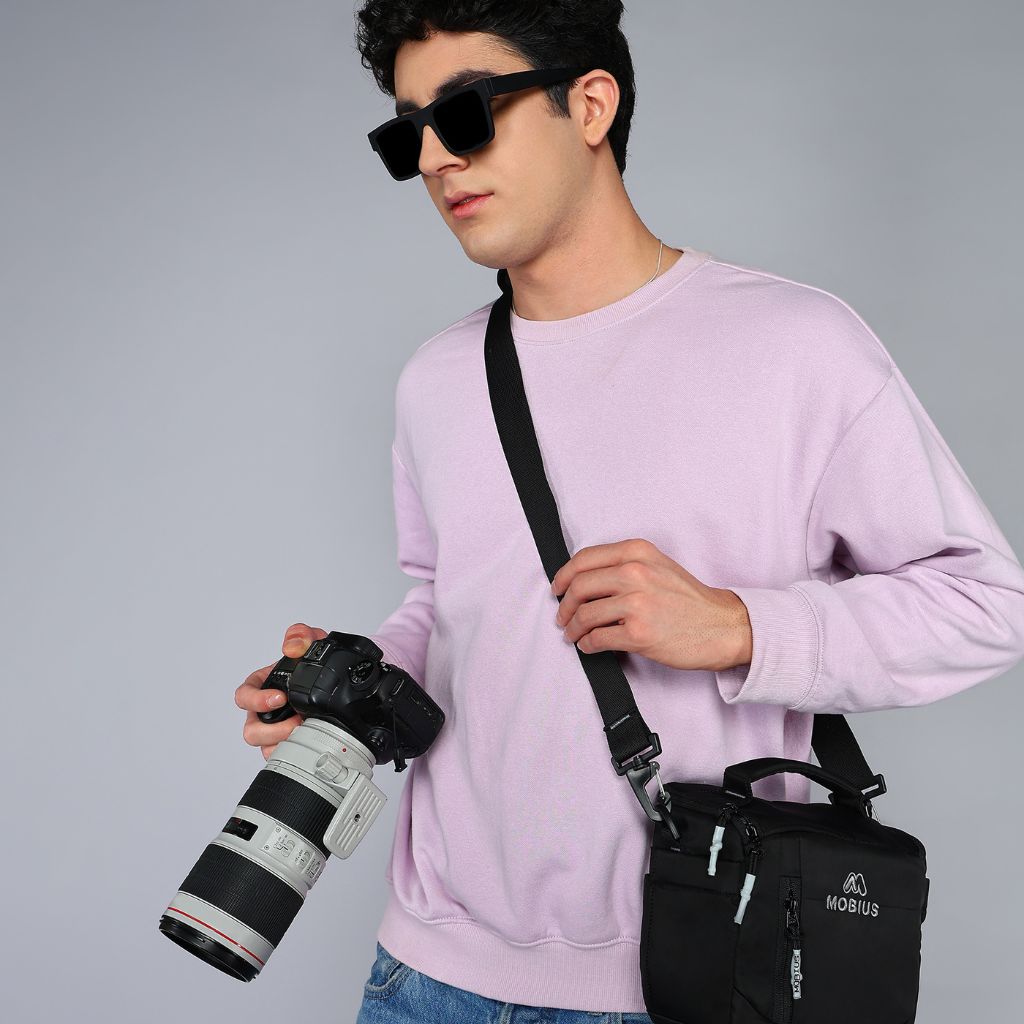 A modern, multi-equipment shoulder bag with quick access to camera and lens.