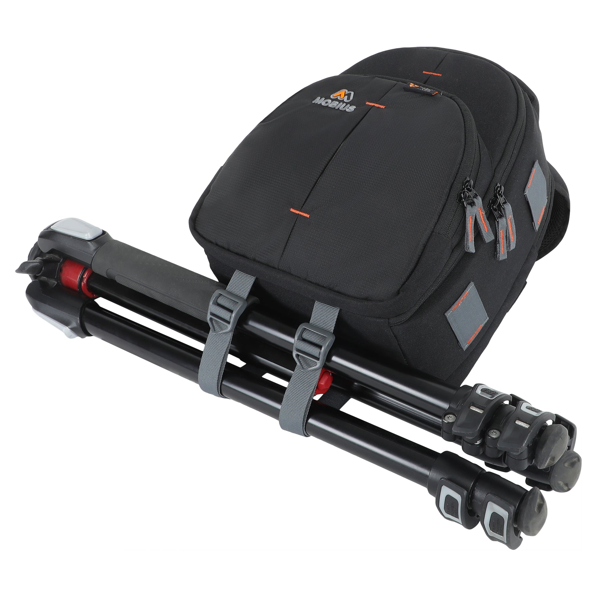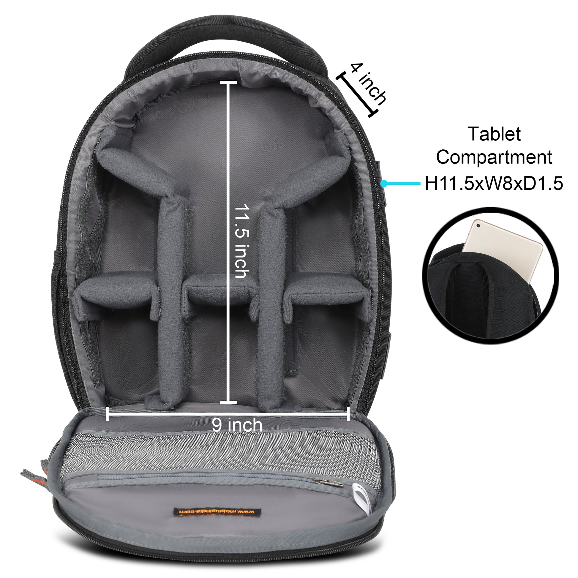 The Focus backpack holds a standard DSLR Camera with attached lens & other lenses with an iPad/Tab. The front pocket accommodates the smaller accessories. The second compartment is dedicated for your iPad. The spacious main compartment for your camera gear includes flexible removable dividers that can be configured to accommodate whatever gear you carry. For carrying comfort, the back of the backpack is made from a breathable, small-mesh, padded material and features a padded shoulder harness. An all-weather rain cover can be stored in the front pocket.