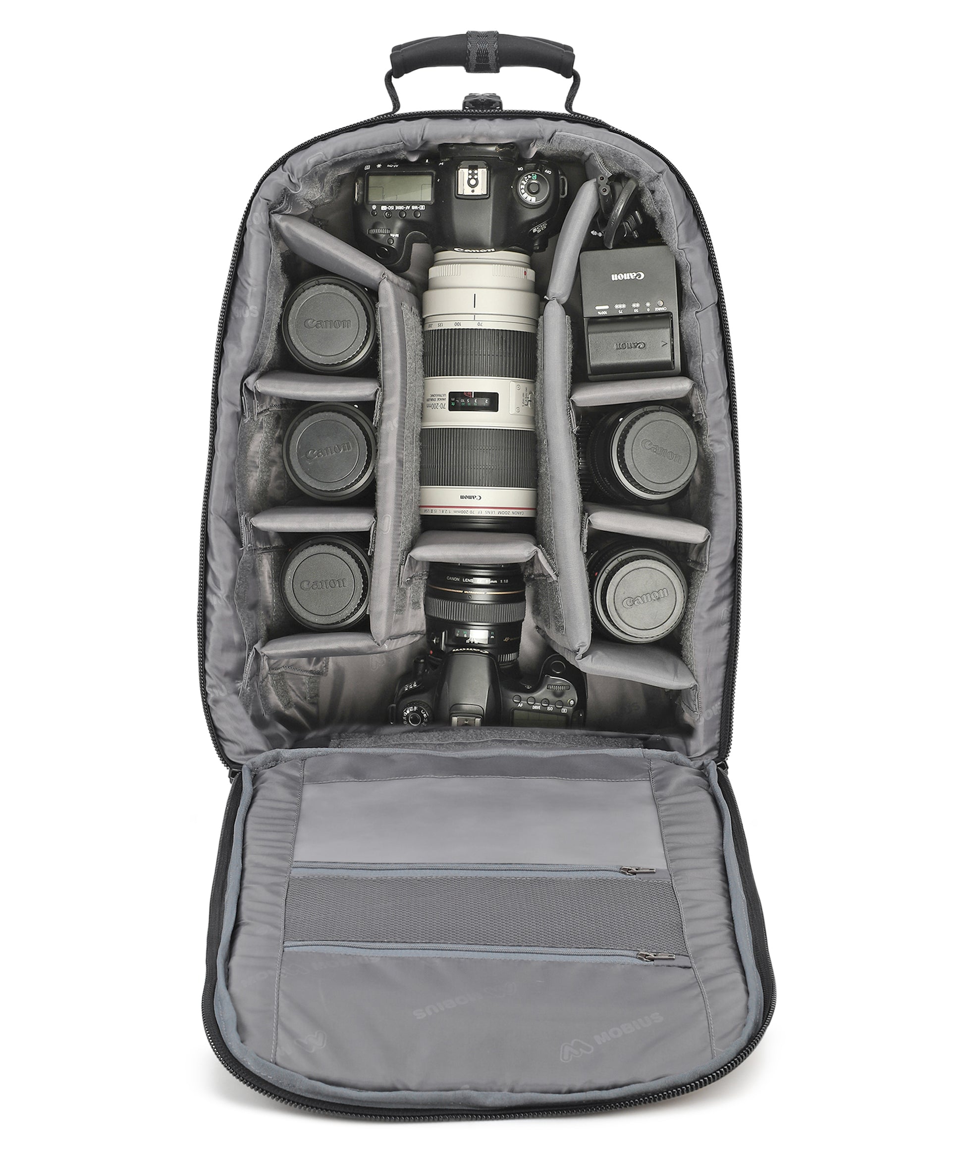 A Pro photographer's backpack, crafted to organize and protect maximum gear in a compact design.