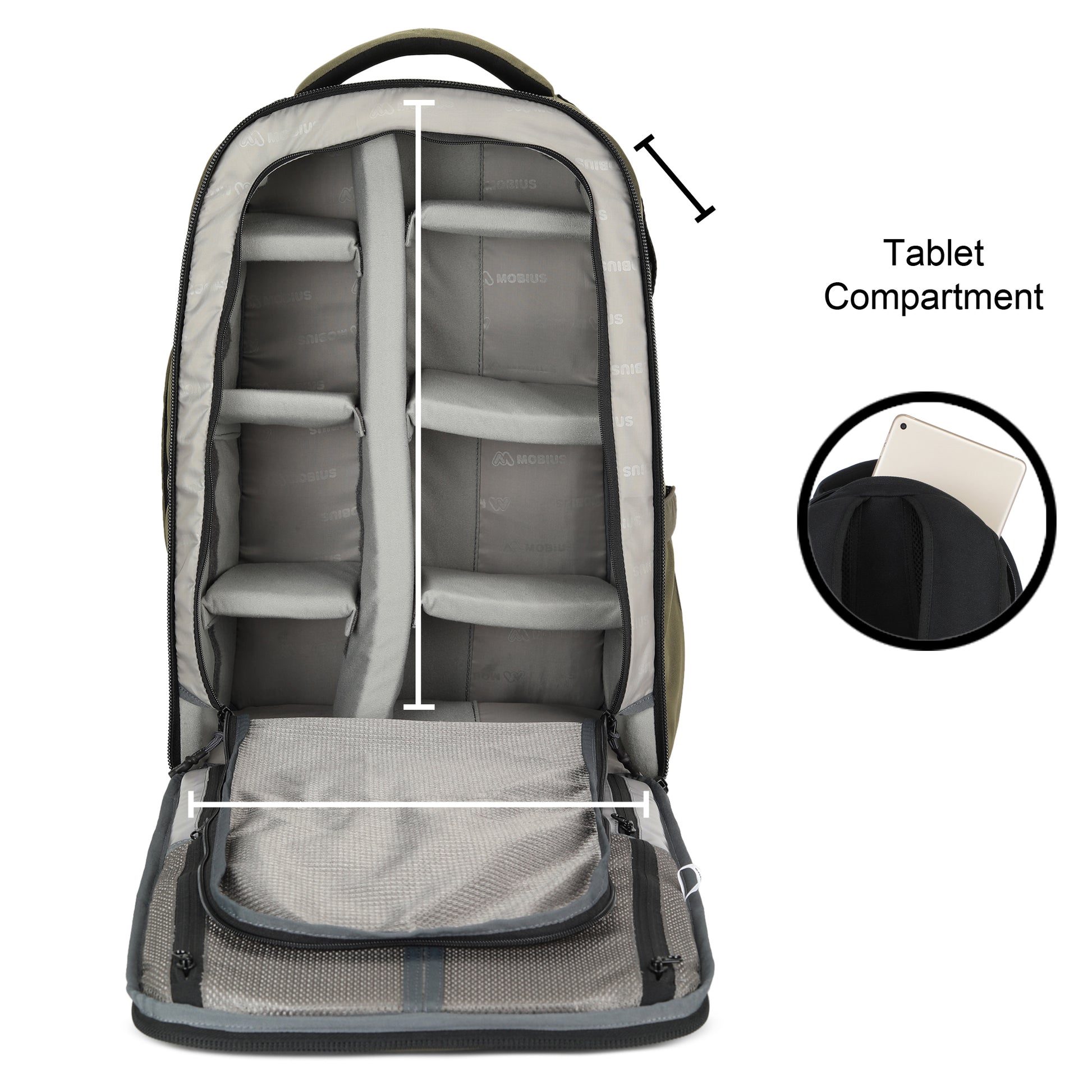 Designed to carry Pro-sized DSLRs and Super Telephoto Lenses.The updated MOBIUS Ninja carries all the camera, lenses & Laptop you need for a wildlife tour, all in an ultralight weight, water-resistant, sleek pack.A large capacity backpack designed for professionals which will be a right companion to carry all your equipment in one go.The camera backpack has a double security feature i.e in case the main zipper fail is left open, the inner zipped mesh flap will always protect your equipment from falling out accidentally.The camera backpack has a sleek laptop compartment in the front which avoids transfer of weight of your equipment on the laptop.The MOBIUS Ninja Pro is crafted using a high density Water-Resistant Nylon fabric and the YKK zippers used are wide and strong for fluid action and effortlessness, it zipper doesn’t get jammed due to dust when you really need to access it.One side pocket can be used to carry a large water bottle & the other side pocket can be used for a tripod with tripod head and it has a strap on top to secure the entire tripod without shifting while trekking or hiking.It has a built-in easy access water-resistant rain and dust cover.
